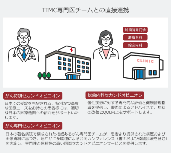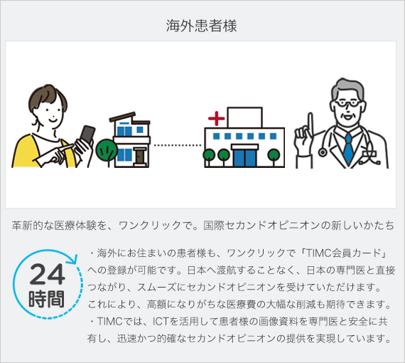 TIMC会員カードにご登録いただくことで、ご自宅にいながら日本の専門医によるセカンドオピニオンを受けることができます。渡航や仲介を必要とせず、安心してセカンドオピニオンサービスをご利用いただけます。